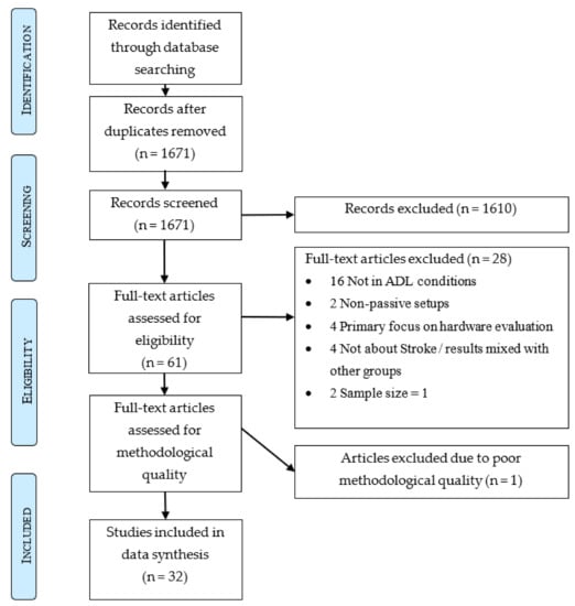 The database search yielded 2561 studies. After removal of duplicates, 1671 remained. Application of the eligibility criteria excluded 1610 articles during title and abstract screening and 28 articles during full-text screening. The remaining 33 articles were assessed for methodological quality. One study was excluded due to poor methodological quality, scoring only four points (Supplementary Materials). Out of the remaining 32 studies that were included for data synthesis, 29 (91%) were of high quality [5,8,9,10,11,19,20,21,22,23,24,25,26,27,28,29,30,31,32,33,34,35,36,37,38,39,40,41,42] and three (9%) of moderate quality [43,44,45]. This inclusion process is described in Figure 1. A summary of all included studies is presented in Appendix A in Table A1 (continuous recording in the clinic or during rehabilitation) and Table A2 (continuous recording during ADL).