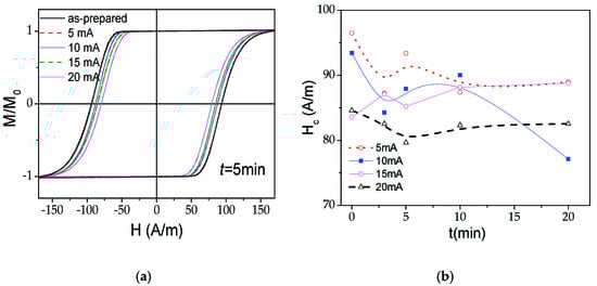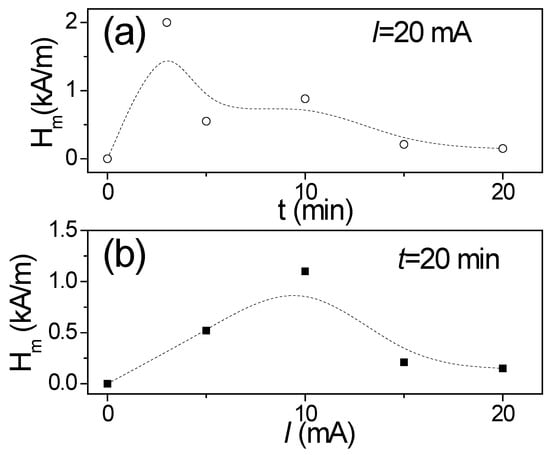 Accordingly, Hcirc varies from zero on the microwire axis to the maximum value (Hcirc ≈ 0.43 kA/m for I = 20 mA) on the metallic nucleus surface. This Hcirc-value at the surface is superior to the Hc-values obtained from the hysteresis loops (see Figure 1a). Taking into account that the surface layer of the magnetic microwire is magnetized by Hcirc, during Joule heating, one can expect the appearance of induced magnetic anisotropy on the surface. Consequently, the evolution of magnetic anisotropy, as evidenced by Hm(t) (Figure 6a) and Hm(I) (Figure 6b) dependencies, can be associated to the counterbalance between the shape, magnetoelastic and induced anisotropies.