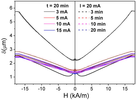 Generally, a double-peak ΔZ/Z(H) dependence in magnetic wires is attributed to the circumferential character of magnetic anisotropy, in contrast to single-peak ΔZ/Z(H) dependence predicted for magnetic wires with axial magnetic anisotropy [21,77]. Additionally, the magnetic field of the maximum in ΔZ/Z(H) dependencies is associated to the magnetic anisotropy field, Hm, [21,22,77]. Therefore, the observed transformation of ΔZ/Z(H) dependence upon Joule heating must be attributed to a change of the character of magnetic anisotropy from axial to transverse. However, only a slight modification of hysteresis loop consisting in a slight decrease in Hc upon Joule heating is observed (see Figure 1). The shape of the hysteresis loops of as-prepared and Joule heated samples is quite similar. The origin of such a discrepancy can be understood considering that the GMI effect involves only the sample portion within the skin depth. From measured ΔZ/Z(H) dependences, we tried to evaluate the modification of Hm versus I or t. For this evaluation, we selected f = 500 MHz, considering that at 500 MHz, all annealed samples present double-peak ΔZ/Z(H) dependence. As can be seen from Figure 6a,b, there is an increase in Hm, followed by a decrease, with an increase in either t or I.