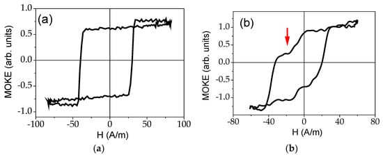 The MOKE technique can provide additional information of surface magnetic properties. Similarly to bulk hysteresis loops, an almost perfectly rectangular MOKE hysteresis loop is observed in the as-prepared sample (see Figure 8a). Such character of hysteresis loops must be related to the axial magnetic bistability.