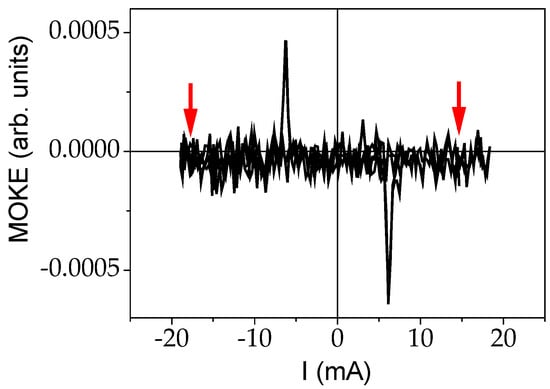 The MOKE signal measured versus electric current flowing along the microwire (proportional to the circular magnetic field) is provided in Figure 9. Two pronounced peaks are observed. In the presence of a circular magnetic field, the magnetization reversal occurs between two circular states. Given that we are using longitudinal MOKE, the two circular states give “0” MOKE signal (marked by red arrows). The two observed peaks must be associated with sharp jumps between two circular (or inclined) states, in other words, the effect of circular magnetic bistability, as previously described [82].