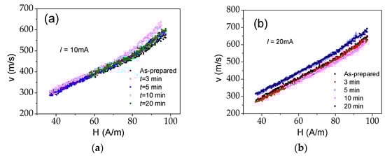 The perfectly rectangular character of hysteresis loops of as-prepared and all Joule heated samples (see Figure 1a) suggests that the remagnetization process of all the samples runs through a single DW propagation. Accordingly, we measured v(H) dependencies of as-prepared and Joule heated samples. As can be observed from Figure 10, generally, Joule heating allows DW velocity improvement.