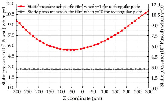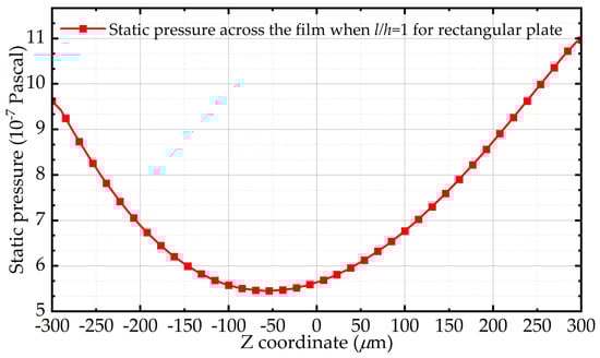 Furthermore, Figure 5 depicts the static pressure of the air film central point along the z-axis with different aspect ratios for rectangular plates. It is likewise interesting to observe that the pressure across the film varies significantly in low aspect ratios. Besides, the pressure change also becomes smaller with the aspect ratio’s growth, which confirms that the finite size effect is related to the pressure change across the film.