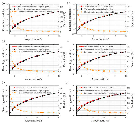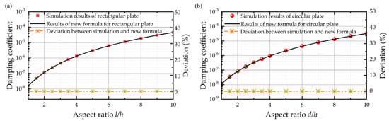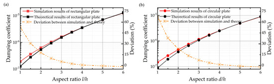 The original theoretical damping coefficients for the rectangular plate and circular plate are derived from the Reynolds equation with trivial boundary conditions, and the expressions are listed as Equations (9) and (10). As a comparison, the simulation results and theoretical results of a rectangular plate and circular plate with the finite size effect only are shown in Figure 4. They are similar to the rectangular plate and circular plate in that the deviations between the simulation results and theoretical results are considerable when the aspect ratio of plates is not sufficiently large. When the thickness of the air film is equal to the length of the plate, the deviations between the original expression and simulation result reach 237.240% and 266.67% for the rectangular plate and circular plate, respectively, owing to the neglect of the finite size effect. Besides, the results demonstrate that the deviation between the theoretical results and the simulation results decreases dramatically with the increasing aspect ratio. When the aspect ratio of the plate is larger than 7, the relative error of the original expression is less than 5%.