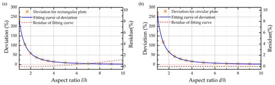 Fitting curve of deviations between the simulation results and theoretical results along with the residue of the fitting curve when the air film thickness is 0.6 mm for the (a) rectangular plate and (b) circular plate.