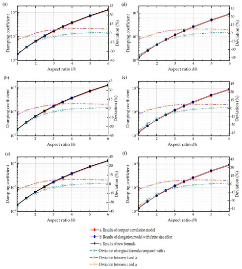Damping coefficients of simulation results with the compact model and elongation model with the finite size effect and theoretical results of the compact modified calculating formula along with the deviations between them. (a–c) Rectangular plate when the air film thickness is 0.06 mm, 0.6 mm, and 6 mm from top to the bottom. (d–f) Circular plate when the air film thickness is 0.06 mm, 0.6 mm, and 6 mm from top to the bottom.