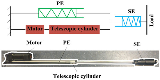 It is well known that the skeletal muscles of humans are excellent actuators, which have good performance and compliance with small weight. There are many elastic elements in skeletal muscles playing a major role during motion. Hill proposed a macroscopic three-element elastic muscle model [38]. According to this model, a skeletal muscle is composed of a contractile element (CE), a series elastic element (SE) and a parallel elastic element (PE). The similarity between these three elements and the current state-of-the-art of compliant actuation concepts is clear. The skeletal muscles can be regarded as SPEAs. With reference to the muscle model, the stiff linear actuator mentioned above can be modified with series of elastic elements and parallel elastic elements, as shown in Figure 2.
