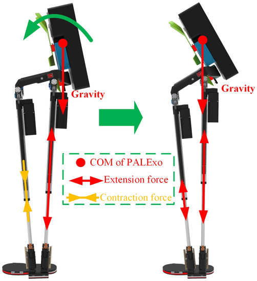 The main parameters of the three selected springs are shown in Table 3. It should be especially explained that the selected CFSs of the SEMS in the two chains of PALExo’s single leg are different, because of the different output contraction force requirements of the two actuators in the two chains. For example, PALExo is usually hung on a fixed frame when it is not working. The loads on the back of PALExo leave the COM of PALExo located behind the two actuators, as shown in Figure 6. The front actuator is supposed to output a relatively large contraction force to adjust PALExo’s COM at the initial moment when the exoskeleton is energized.