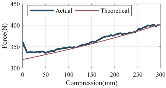 The telescopic cylinder is applied to identify the stiffness of the gas spring. Firstly, the telescopic cylinder is controlled to extend and contact at a constant speed of 0.01 m/s. The current of the motor is measured to calculate the output force of the telescopic cylinder, which is equal to the friction of the telescopic cylinder. Secondly, the gas spring is installed in parallel with the telescopic cylinder to constitute a PEA. The PEA is controlled to extend and contact at a constant speed of 0.01 m/s, and the current of the motor is measured. Finally, the extension force of the gas spring at different positions can be calculated. At a certain position, the output force of the telescopic cylinder is equal to the vector sum of the friction of the telescopic cylinder, the extension force of the gas spring and the friction of the gas spring, as shown in Equations (6) and (7).