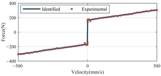 To identify the friction force, the electric cylinder is controlled to move at different constant speeds and the motor torque is recorded. The friction force can be obtained by subtracting the extension force of the gas spring from the motor torque. A method based on a genetic algorithm has been introduced in [37] to identify the friction force of the electric cylinder. The same method is used to identify the total friction force of both the electric cylinder and gas spring in this paper. For the sake of simplicity, we will not repeat it. The friction force curve identified is shown in Figure 9. The identified LuGre model is expressed as Equation (16).