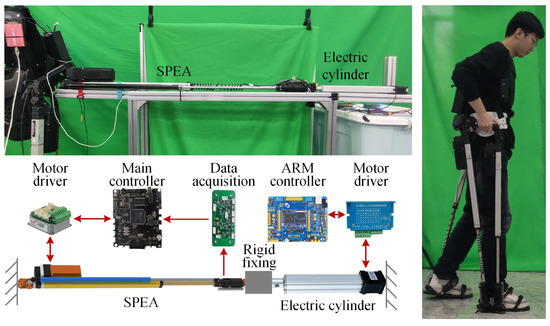 To verify the effects of the above two SPEA control strategies, several experiments are carried out under the experimental conditions shown in Figure 10. An electric cylinder (IP42X-300: SKISIA Inc., Wuxi, China) is used for testing the performance of the control strategies. The electric cylinder and the SPEA are all fixed on the same aluminum frame at their tails and are fixed together at their heads. The SPEA is controlled by the main controller of the PALExo and a motor driver (SimplIQ SOL-WHI 20/60E: Elmo Inc., Petach-Tikva, Israel). The AOC of the SEM is collected by a data acquisition circuit board. The electric cylinder is controlled by an ARM-based controller (Apollo STM32F767 development board: Alientek Inc., Guangzhou, China) and a motor driver for the stepping motor (CA-230: YASKAWA Inc., Kitakyushu, Japan).