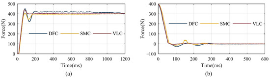 The response curves of step signal with different control strategies. (a) Response curves when the target force is 400 N; (b) response curves when the target force is 0 N. DFC, SMC, and VLC respectively indicate the direct force-control based on the PID with a DOB, sliding mode control with the DOB mentioned in Section 4, and a cascaded PID control with an inner velocity loop and the DOB mentioned in Section 4.