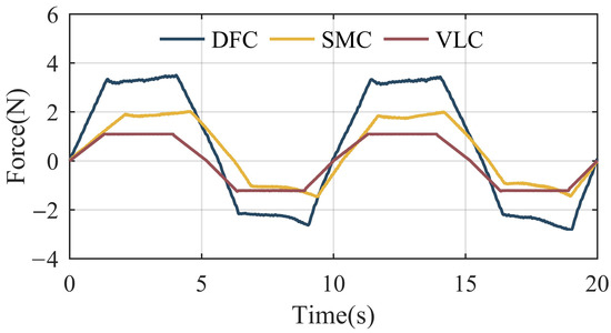 It can be seen from Figure 12 that the maximum values of the interaction force with DFC, SMC, and VLC are 3.2 N, 2 N, and 1.1 N, respectively. The cascaded PID control with an inner velocity loop and a DOB performs best in above experiments among the three different control strategies.
