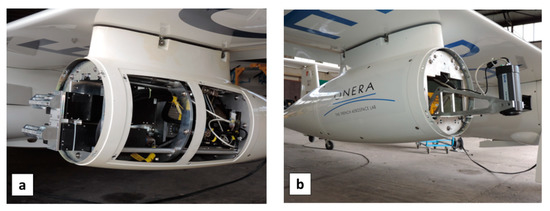 (a) VNIR1600 and SWIR320m-e HySpex hyperspectral cameras on-board left pod of motor-glider STEMME; (b) IR microbolometer camera (FLIR A325) onboard right pod.