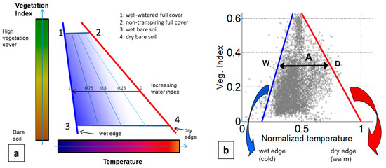 where and are the temperatures read on the respective “dry” and “wet“ edges at the same VI-level as the considered pixel. Thus, the water index corresponds to the relative distance from point A to the “dry” edge, at iso- level of vegetation-index.