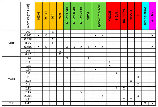 Considered spectral bands, spectral indexes and multiwavelength methods. The combinations involving wavelengths in the visible to NIR range are in orange, those with wavelengths from the visible to SWIR range are in green, those with wavelengths in the SWIR range only are in red, and the T-VI method is in purple. The use of the thermal infrared signal alone was considered as well (blue case).