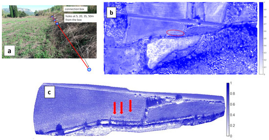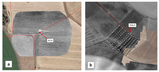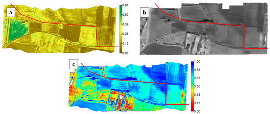Significant contrasts were also obtained with the UAV (Figure 13a, Figure 14a and Figure 15a). Thanks to a higher spatial resolution due to the lower flight height (resolution was 7 to 9 times better than with the MAV), the UAV cameras could even make the distinction between a recent leak event and former leak events that occurred in the three previous days (Figure 14). The upper arrow in Figure 14b indicates a small area of high moisture resulting from the vane opening on the same day. The lower arrow indicates an area of larger extent, turning south and encompassing the former area, and showing lower moisture values (but still higher than the rest of the field); this is the result of former vane openings performed during the previous three days. With regards to the question of whether the WI contrast resulted from a temperature contrast or a VI contrast, we can state that in the case of bare soil conditions (H11), a contrast related to water presence was revealed in both OSAVI and TIR images (although with higher strength in the TIR image), whereas, in the presence of vegetation (H5.6, H10), a contrast was observed essentially in the TIR image alone (not shown here).