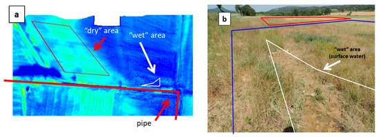 The cold (blue) and warm (red) edges of the T-VI scatterplot have been positioned so that the trapezoid pattern contains essentially all the scatter, except for maybe a few outliers (Figure 2b). The inferred Water Index (WI) is in Figure 4c, where a high value of WI (in blue) means that the soil moisture is at the highest level for the considered VI level. The triangular area with a low temperature in Figure 4b is related to high WI values (WI > 0.84). A close-up is reported in Figure 5a where the closest water pipe location has been added. Two areas have also been drawn to help interpret the results. The so-called “wet” area, which is in a meadow field, corresponds to a very humid zone located just north of the pipe, not far from a 90° turn, with mud and even a puddle with spurting water from the soil (see the picture in Figure 5b). A “dry” area (red polygon) was selected for reference in a well-drained field just uphill to the west that was also covered with a meadow (Figure 5b).