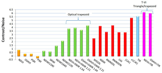 Indexes based on VNIR signals alone led to very poor results (orange bars): the signal variability (standard deviation) in the “dry” and “wet” areas was actually higher than the mean difference (contrast), which gave a contrast-to-noise ratio lower than 1. The contrast seen in the PWI image was even negative, however, this has little significance since the PWI values on the “dry” and “wet” areas were close to one another, namely 1.09 and 1.07, but presented a correspondingly high standard deviation of resp. 0.06 and 0.08. Better results were obtained when combining VNIR with SWIR (green bars) or when using SWIR signals alone (red bars). For example, a C/N higher than 3 was obtained with the following indexes: NSMI, RNINSOL, RNINSON, CAI, or with the “Optical Trapezoid Method” described in [56]. However, the best results (i.e., C/N > 5.5) were obtained with the thermal infrared data, either by considering the raw radiance temperature image alone (C/N = 5.6) or, a little better, through the Triangle/Trapezoid Method by combining it with NDVI (C/N = 6.1) or OSAVI (C/N = 6). In summary, the strongest signature of soil moisture was in the TIR image. The Triangle Method still improved the results slightly, however, using OSAVI or NDVI for the T-VI scatterplot was quite equivalent.