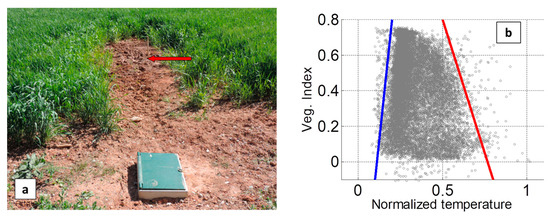 Soil water content and crop water deficit have been evaluated with the so-called Triangle Method, which uses more synergistically TIR data and visible-to-NIR data [24,25,26,27,28]. The principle of this method lies in the following observation. Since the relationship between temperature and water content is different between vegetation and bare soil, the mean temperature sensed by the remote TIR sensor depends not only on the water content but also on the vegetation cover-fraction in the considered pixel. For this reason, there is an intrinsic ambiguity in the deduction of moisture, or in the simple detection of leakage spots from the mean temperature as provided by a thermal sensor integrating the infrared radiance in mixed pixels. Independent information about the vegetation cover-fraction is therefore required to eliminate the ambiguity. Introducing a vegetation index (VI) as a proxy of the vegetation cover-fraction solves the problem. Classical vegetation indexes are inferred from the visible and near-infrared (NIR) signals provided by one or two additional cameras. The temperature and the VI obtained over an area presenting a broad diversity both in cover-fraction and in humidity provide a 2D scatterplot with a roughly triangular shape, which explains the name of the method: the Triangle Method [24,25,26]. Actually, the vertex of the triangle related to dense vegetation is often truncated, giving a trapezoidal shape, see [24,25,26,27,28]. The low-temperature boundary of the scatterplot is related to pixels/surfaces with the highest moisture and evaporation/transpiration rate (“wet” edge), whereas the high-temperature boundary is related to pixels/surfaces with the lowest moisture and evaporation/transpiration rate (“dry” edge). As a consequence, a water index (or the complementary dryness index) is assigned to each point from its relative position with respect to the “wet” and “dry” edges of the triangle/trapezoid scatterplot.