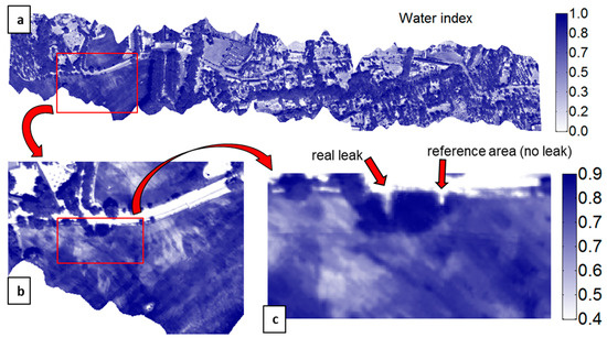 The WI maps obtained with the MAV and UAV do not reveal a significant contrast along the leaking pipe, except in some faint spots, not exactly corresponding with the actual leaks n°1 and n°2 (Figure 10b,c). These results suggest that for successful leak detection it is necessary to select a time of year when the difference in evaporation flux between a leak area and its surroundings is maximized.