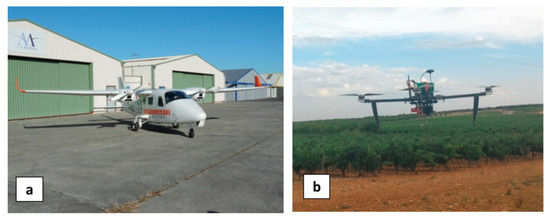 (a) Airplane platform (MAV) and (b) UAV platform equipped with two specific multispectral sensor systems.