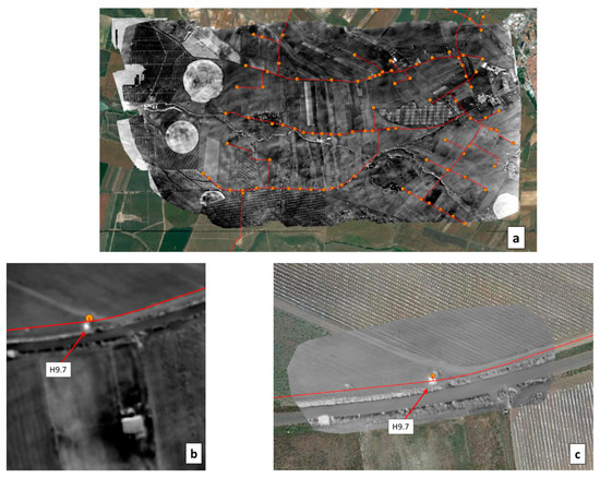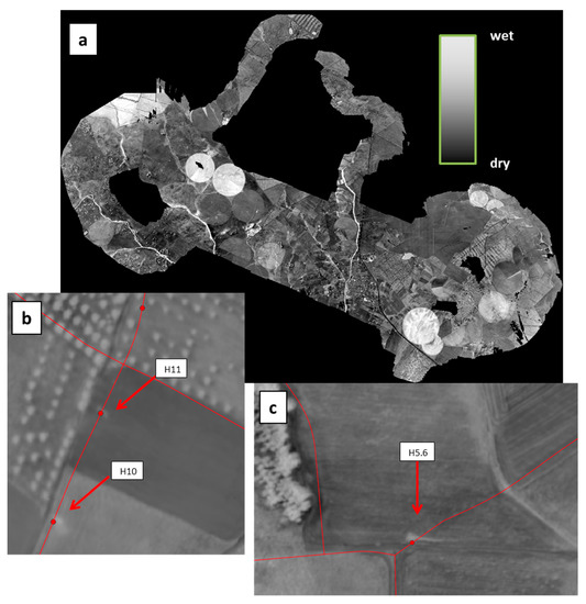 (a) WI map obtained on 16 May 2019 with the MAV over the Monte Novo district around São Manços, Portugal. The covered area is about 2 km × 10 km. (b) Detail of the WI image overlaid with the water network (in red) showing hydrants H10 and H11. (c) Same with hydrant H5.6. The three vanes were opened for periods from 10 to 60 min during the previous three days to simulate leaks.