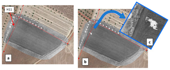 WI images obtained with the UAV on 14 May 2019 over the test field containing hydrant H11, (a) before and (b) after the vane was opened to simulate a leak; (c) is a close-up over the hydrant area. The WI images are in greyscale (white for wet and black for dry), the water network is overlaid in red and Goggle Earth data (in color) fill the surrounding area. Covered area is about 130 m × 240 m. The contrast between wet and dry soil is very high.