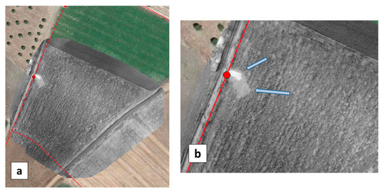 (a) WI obtained with the UAV on 16 May 2019 in the test field containing hydrant H10. The WI image is in greyscale (white for wet and black for dry), the water network is overlaid in red and Google Earth data (in color) fill the surrounding area. (b) Close-up of the WI image with arrows indicating two contrasted areas (see text).