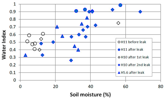 Optical methods could be an alternative, as optical properties change with moisture content in soil and vegetation. A well-known observation is the darkening of the soil surface when water is added, which results from a decrease in its reflectance in the visible spectrum. The estimation of the soil moisture content from multispectral or hyperspectral remote sensing data strongly depends on the availability of a database that is representative of all the soils encountered in the scanned area since the correlation between the moisture content and the reflectance spectrum is conditioned by, among other properties, the texture of the soil, and the presence of organic matter and crust [9]. In addition, these databases refer to bare soils, which are not the most frequent type of surfaces met in areas where leaks in water transportation means are sought. Notice that the penetration depth of optical sensors in the visible to short-wave range (i.e., [0.4–2.5 µm]) is significantly lower than for microwave sensors: the moisture content evaluated by the former type of sensor is that of the uppermost layer of the soil column.