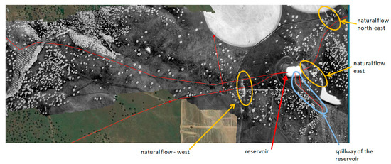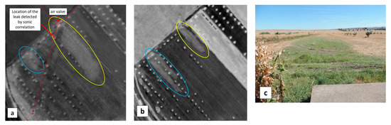 Nine suspicious areas were discarded because no water accumulation was found around the considered hydrant or network structure. The explanation for the WI contrast nonetheless observed in September 2019 is that, due to previous rains and irrigation sequences, water was available for weeds, especially if the hydrant is at a lower point, and, due to the absence of herbicides or harrowing of the soil, vegetation inevitably took advantage of the situation, giving rise to a spot with reflectance variations and possibly a local increase in evaporation, which ultimately induced a WI increase. In the future, to avoid this type of false alarm, the WI threshold used for warning should be increased correspondingly.
