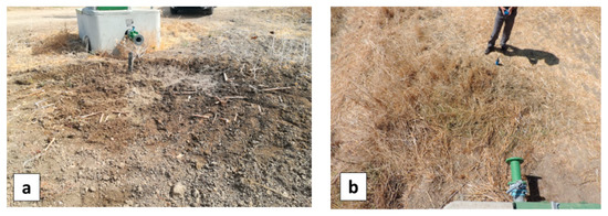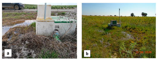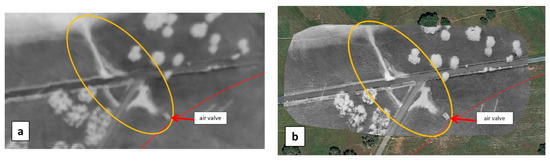 One detected spot actually corresponded to a soil depression close to a hydrant that was recurrently filled with water to water the cattle. Two other WI anomalies were attributed to a leak from the connection between the hydrant and the farmer’s infrastructure. Finally, a clear WI anomaly was observed at hydrant H9.18 (Figure 24a), where the first inspection on 16 April 2020 revealed a large puddle (Figure 25a). As the hydrant was used during the summer irrigation campaign, the detected WI anomaly might be explained by a leak from the connections between the hydrant and the farmer’s infrastructure. In addition, the hydrant is located at a low topography point which could have led to water accumulation at this spot, either from irrigation water before the remote sensing campaign in September 2019, or from rain, before the visit in April 2020. The next visit, in June 2020, showed again a large puddle around the hydrant (Figure 25b), yet the weather had been dry for a long time and the hydrant was not used for irrigation at this time. In addition, water leaking inside the hydrant’s concrete structure was clearly heard, definitely confirming that the WI anomaly revealed a leak.
