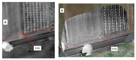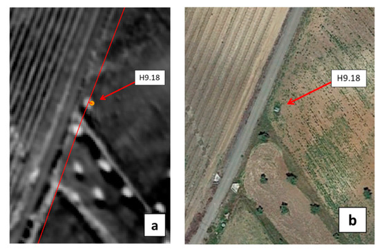 (a) WI image showing hydrant H9.18 as obtained with the MAV (excerpt from Figure 22a). (b) Google Earth image of the same area.