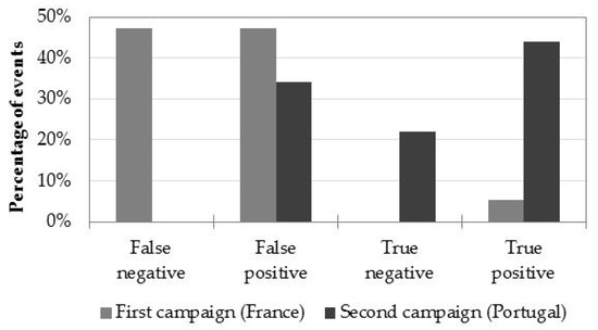 Overall, the T-VI multispectral system was able to successfully identify true events in approximately 50% of the occasions. There is a significant improvement in the performance of the method from the implementation (France) to the validation (Portugal) phases, with a 65% rate of correct detections (Figure 26). The implementation of the gyrostabilized platform in the MAV, and advances in the image processing workflow were the main responsible factors for that improvement.