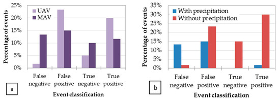 The performance matrix analysis was based on the classification of these 60 events as true positive/true negative/false positive/false negative events (see Figure 26), and on the influence of the parameters considered most relevant, namely, the technology used (UAV/MAV, see Figure 27a), the environmental conditions such as precipitation in the previous 10 days before the flight (Figure 27b), vegetation type (Figure 28a), and soil type (Figure 28b).