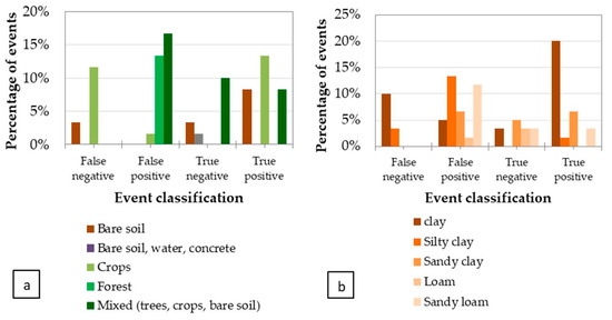 Relation between the event classification and (a) the type of vegetation or (b) the type of soil.