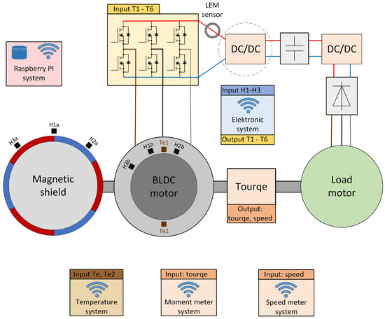 As part of the work, the BLDC research engine was composed and examined. Various variants of the motor power supply and various sensors for determining the angular position of the motor shaft were tested. The tests used a three-phase electronic commutator bridge system with an optional DC/DC converter and an electronic commutator system. Both of these systems were designed and created as part of our research work. The scheme of the test stand with the installed measuring infrastructure is shown in Figure 1.