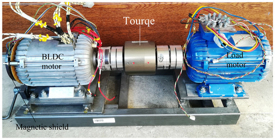 The basic element of the test stand is a BLDC motor connected by a shaft to a three-phase loading machine excited by permanent magnets. The shafts of the motors are connected with a torque meter via clutches, which are shown in Figure 2. The tested motor is equipped with additional measuring windings located in the stator and a set of hall sensors installed in the stator. These sensors are used optionally to determine the angular position of the rotor. The shafts of both machines were connected via Dataflex 22/20 torque gauge in order to measure the load of the tested engine. An additional external sensor (developed by us as a part of research) is attached to the motor shaft, which allows us to determine the angular position of the rotor, described as a Magnetic shield. Optionally, this sensor can be replaced with a 10-bit MAL 405-PA encoder, the output signal of which is in the form of a Gray code. The motor is powered by an electronic commutator with T1-T6 transistors as switching elements. The control is based on the ATtiny microcontroller. Optionally, signals from sensors determining the angular position of the rotor are supplied to the microcontroller. On the other hand, the output signal is the information which of the bridge transistors is to be driven. The stand is built in a reverse operation system, that is, electric energy obtained from the loading machine after rectification by a rectifier system consisting of six diodes and after processing by a DC/DC converter, is transferred to the battery bank from which the BLDC motor is powered. Thanks to this solution, only the energy needed to cover losses in the test stand is taken from the power grid.