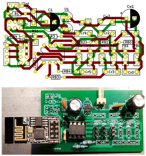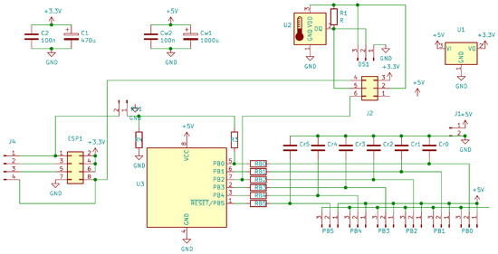 The research infrastructure of the test stand was designed based on Wi-Fi communication. The Raspberry Pi class microcomputer serves as the master server for collecting measurement data. The measurement modules are connected with the sensors built in the stand by electric wires. Each of the modules is responsible for measuring data and sending them through the ESP 8266 system to the master unit, on which the application that interprets and collects measurement data is running. All measurement modules were created on the basis of the same system (made as part of the work), essentially consisting of the ATtiny 13 microcontroller—connected to the sensor and converting the measurement data into a physical quantity value. The universal measuring system shown in Figure 4 uses the ATtiny13 microcortoler due to the fact that it is equipped with an analog-to-digital converter and has an internal counter with the possibility of selecting a prescaler.