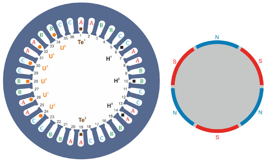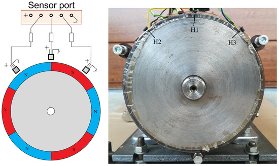 Illustrative drawing showing our developed construction of a BLDC motor: left figure—stator with marked windings and arrangement of Hall sensors , , , additional windings , , and , temperature sensors; right picture—rotor, with three pairs of magnets glued on the side surface of the rotor.