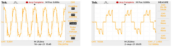 The developed research stand allows us to optionally power the engine in two ways. The first is that the transistors of the electronic commutator bridge are actuated only on the basis of unmodified signals provided by the rotor angular position sensors. The second of the tested variants of motor power supply is that the transistors of the electronic commutator bridge are actuated on the basis of the signal from the shaft position sensors modified by the PWM signal. Examples of the control voltage waveforms (orange) fed to the transistor gate and the voltage on the motor windings (blue) in the case of both power supply variants are shown in the oscillograms in Figure 3. The left waveform shows the waveforms for the variant with DC/DC converter, and the right waveforms shows when the drive signal of the bridge transistors is modified by the PWM signal.