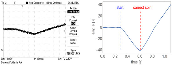 The oscillogram of the analog encoder signal recorded during the start-up of the controlled motor based on the voltages from the additional motor windings (left figure), the graph of the rotation angle versus time corresponding to the oscillogram, with the moment of rotor movement marked (start) and determination of the correct spin direction (correct spin) (right figure).