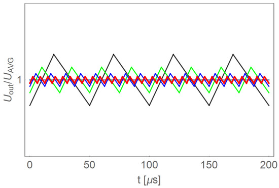 The DC/DC converter has been used to lower the voltage from the battery bank to the required level. Regulation of the output voltage is based on the PWM signal control. A filter reducing the pulsation of the output voltage is applied at the converter’s output. The pulsation of the output voltage depends on the filter time constant and the switching frequency of the PWM transistors. The pulsation reduction can be achieved by selecting a suitably large capacitor and coil or by increasing the PWM frequency. Examples of voltage waveforms are shown for four different PWM frequencies in Figure 12. In order to limit the size of the filter elements, high-frequency control was used.