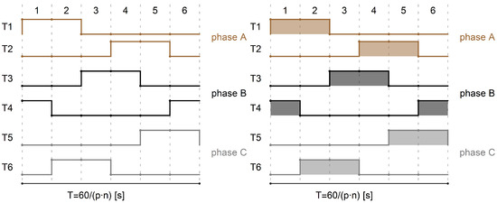 Powering motors from both groups requires the tracking of the angular position of the rotor in order to properly control the valves of the electronic commutator [17,18]. Motors with a sinusoidal distribution of the PMSM magnetic field require a sinusoidal voltage supply, which places greater demands on the electronic commutator system [19,20]. Motors with a (rectangular) trapezoidal magnetic field distribution are powered in such a way that the task of the electronic commutator is only to switch the voltage to the individual windings synchronously with the rotation of the rotor [21,22].