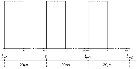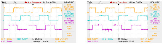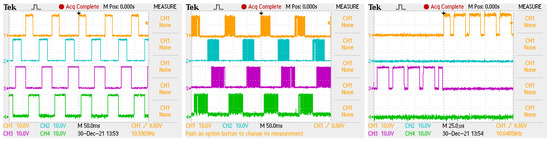 Figure 13 shows the signals controlling the transistors of the electronic commutator bridge for two variants of power supply and motor speed control. The waveforms in the figure on the left are for a system with a DC/DC converter, and in the figure on the right, for a system without a converter. In the second case, the shaded fields visible in Figure 13 mean that the waveform is modulated with a PWM signal. Sample results are visible in close-up form in Figure 14. In both cases of electric supply, pairs of transistors supplying one motor phase ( i , for ) are controlled in such a way that after switching off the transistor of a given phase, switching on the next one takes place only after one control tact. For example, in Figure 13, the transistor is turned off after the 2nd measure of the sequence consisting of 6 measures (marked with the numbers in the upper part of the figure), while the transistor is turned on in the 4th control step. This solution prevents the occurrence of short circuits in the branches of the electronic commutator bridge. It can be assumed that one control cycle is the dead time between switching transistors of a given bridge branch. Figure 15 shows the recorded control waveforms of four transistors supplying two phases of the electronic commutator bridge, where the left figure concerns control with the use of a DC/DC converter, the middle one—without a DC/DC converter—and the right one shows the PWM signal supplied to the bridge transistors in a system without a DC/DC converter.