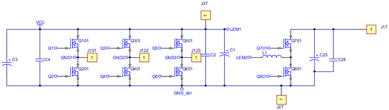 Additionally, as an independent element, a control board for transistors and DC/DC converter was designed and manufactured, the diagram of which is shown in Figure 21. This board was also made as an evaluation circuit allowing additional elements to be connected, for example to filter the signals supplied from the hall sensors. For an illustration of the PCB design, see [9]. The ready circuit dedicated to the tested solution is shown in the photo in Figure 22.