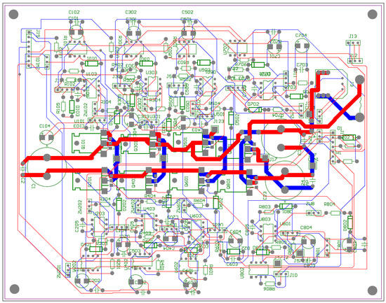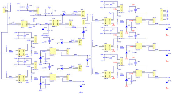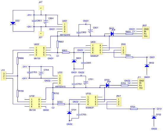 Figure 16 includes six electronic commutator bridge transistors labeled Q101–Q601, and DC/DC converter transistors Q701 and Q801. Between the converter and the electronic commutator bridge, there is a low-pass filter made of inductance L1 and capacitors C1 and C2 C3 C4. The filter’s task is to supply the commutator bridge with low-pulsation DC voltage. In addition, the diagram shows the connection points of the LEM converter used to measure the current consumed by the electronic commutator bridge. Points marked in the diagram as GND1 GND2 GND3 with places of connection of three windings of the tested motor. The control of power transistors in a discrete manner (the transistor is fully conductive or completely blocked) is performed by a microcontroller. Due to the different potentials at the ends of the motor phases, the signal from the microcontroller must be galvanically isolated. In the implemented solution for this purpose, 6N136 optocouplers were used, which are shown in the diagram as U102, U202, U302, U402, U502, U602 for the transistors of the electronic commutator bridge (Figure 17), and the U702, U802 circuits for the DC/DC converter transistors (Figure 18). The output signal from the optocouplers is fed to the gates of power transistors through drivers dedicated to control MOSFET transistors. MAX627 circuits are used as drivers, characterized by the fact that one channel is inverting and the other is not. This feature was used by adding the possibility to feed the signal from one or the other driver’s channel to the transistor’s gate by switching the appropriate jumper. The power supply of individual drivers is provided by individual single watt voltage converters 24 V to 15 V type AM1S2415. These converters in the diagram are marked as U101, U201, U301, U401, U501, U601 for the electronic commutator bridge system (Figure 17), and U701, U801 for DC/DC converter transistors (Figure 18). The entire commutator system with the DC/DC converter was designed and made on one printed circuit board shown in the Figure 19 and its final realization is shown in the photo on the Figure 20. The designed board is of an evaluative nature. It was made with the possibility of conducting various types of research. There are additional terminals on the board and there is a possibility to connect additional additional elements.