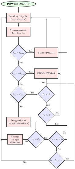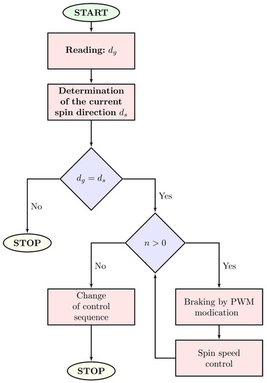 The reversal of the motor cannot be accomplished by simply driving the power transistors in the opposite direction of rotation. To realize the reversal of the BLDC motor, first reduce the speed until the rotor stops by switching the power transistors in the direction of rotation, and only then change the control sequence to the opposite. The speed reduction is preferably accomplished by regenerative braking by controlling the current. After changing the control sequence to the opposite, the motor is started with current control. The microprocessor controlling the electronic commutator implements the algorithm shown in Figure 23, where X indicates optionally: spin speed or driving torque depending on the choice of the control strategy. The parameter means the set value of the controlled quantity, the measured or its current value, the radius of the set value environment, the threshold current value natomias —the measured current value, —system temperature threshold value, —measured temperature value, —set spin direction, —specific current spin direction. The algorithm block responsible for changing the spin direction is presented in detail in Figure 24.