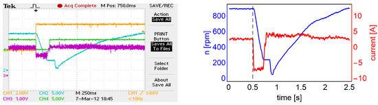 An example of an electronic commutator operation during a reversal is shown in Figure 25. The included oscillogram shows the registration of four signals: pink—current, blue—motor rotation speed coming from the electronic tachogenerator, orange—set rotation direction and green compliance with the set rotation direction. The figure on the right shows the interpreted recording results, where the current is marked in red and the spin speed in blue. This figure shows that the current during braking has negative values, which proves the implementation of regenerative braking.