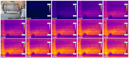 In each of the tested cases, the motor was heated to a steady thermal state, during which the temperature from and thermistors was recorded. An example of the engine heating process is shown in Figure 27. The photos shown here are taken from a thermal imaging camera. Subsequent registrations were performed with the same time step of 15 min.